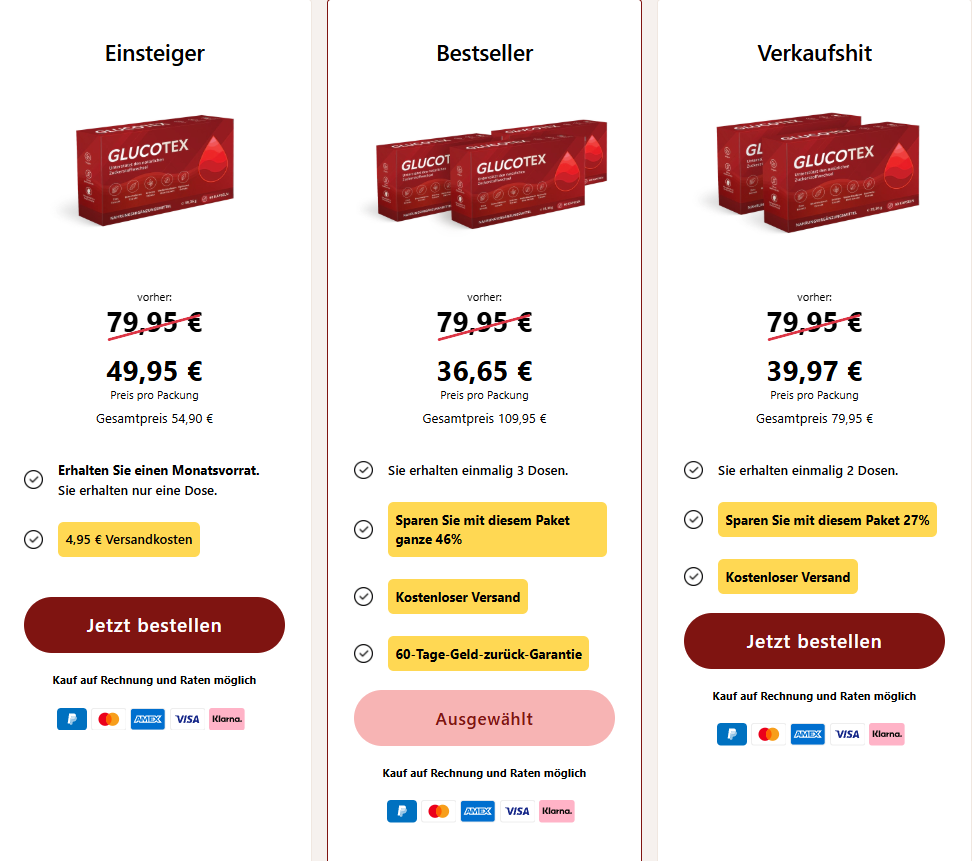 Sich für Glucotex zu entscheiden bedeutet, eine erstklassige, in Deutschland entwickelte Formel zu wählen, die darauf ausgelegt ist, Ihre natürliche Vitalität und Ihr Stoffwechselgleichgewicht jeden Tag zu unterstützen. Wenn Sie sich Ihren Vorrat noch heute über dieses offizielle Angebot sichern, investieren Sie nicht nur in 100 % natürliche, hochwertige botanische Inhaltsstoffe, sondern profitieren auch von unserem exklusiven Rabatt von 46 % auf unser „Best Seller“-Paket.